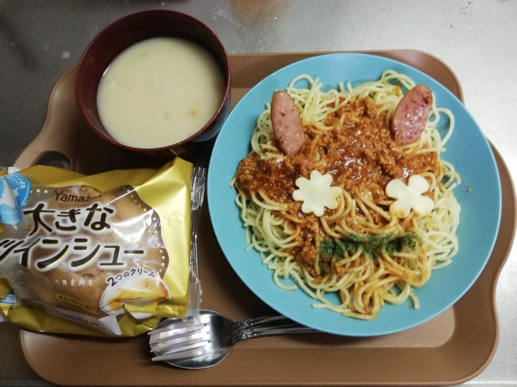 🌸パスタ(挽き肉、玉ねぎ、しめじ、ローリエ、ケチャップ、トマトピューレ、コンソメ、塩、コショウ、スライスチーズ、ウインナー、パセリ、その他)