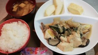 🌞11/10(月)肉豆腐ランチ🌸肉豆腐(豚肉、玉ねぎ、長ネギ、生しいたけ、焼ちくわ、結びしらたき、豆腐、その他)🌸小鉢・厚焼き玉子(砂糖、みりん、だし、卵、その他)🌸デザート(ラ・フランス)(ちんすこう)🌸味噌汁(長ネギ、ワカメ、油揚げ)🌞...